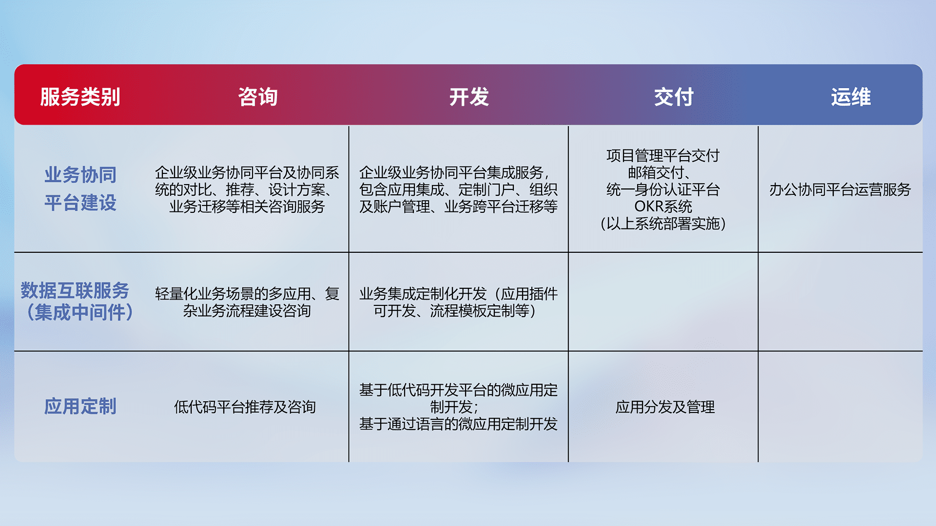 针对钉钉、、、、企微、、、、IDaas等平台级产品提供产品的规划、、方案、、交付、、、定制化开发等服务,,,,实现如统一协同办公、、智能客户服务、、混合会议管理、、智能数据查询、、、、等业务场景,,,实现数字化转型。。。。